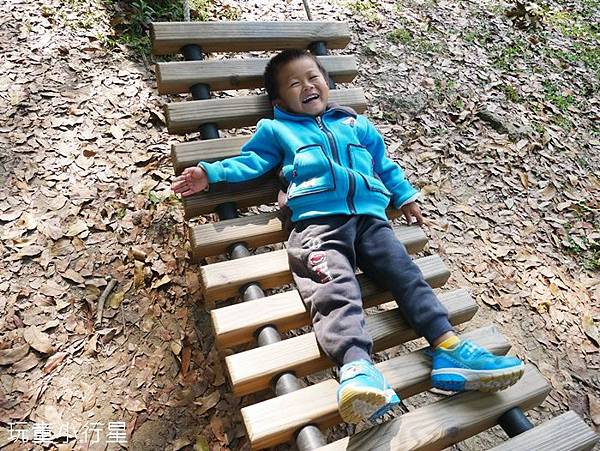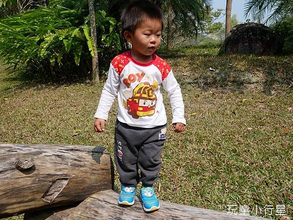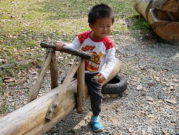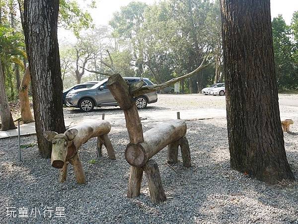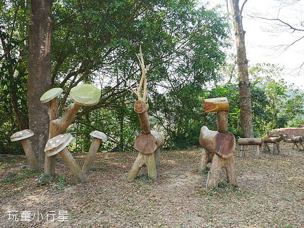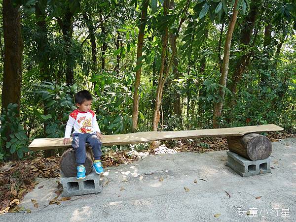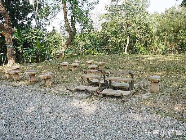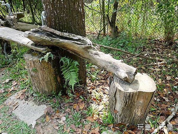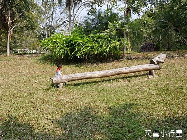 園區內常可見以原木製成的座椅、遊具,融入自然景觀,讓人看了非常喜歡。