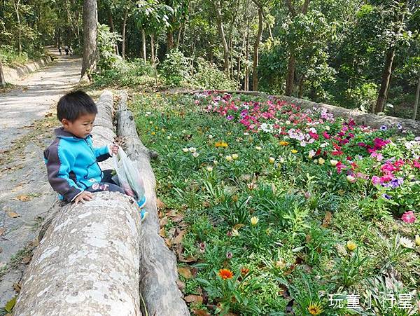 位於木棧平台旁的小型花圃,四周以原木樹幹當圍籬,雞腿寶坐在樹幹上賞花。