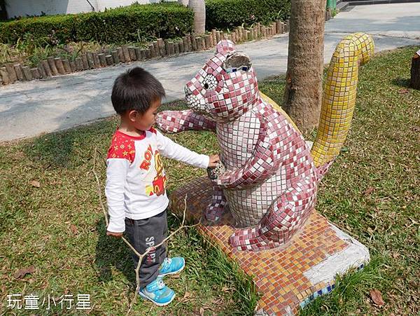 園區裡偶可遇見馬賽克拼貼的動物裝置藝術,雞腿寶伸手觸摸松鼠的橡實果實,松鼠的手仿佛在拍他的肩膀一般。