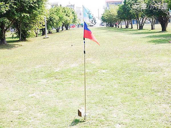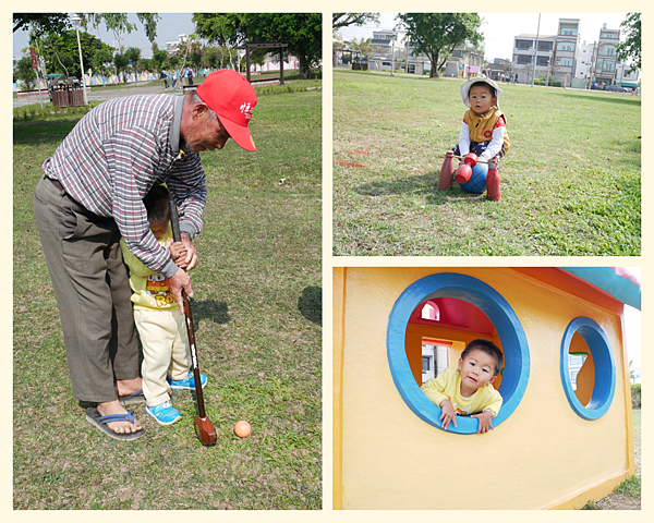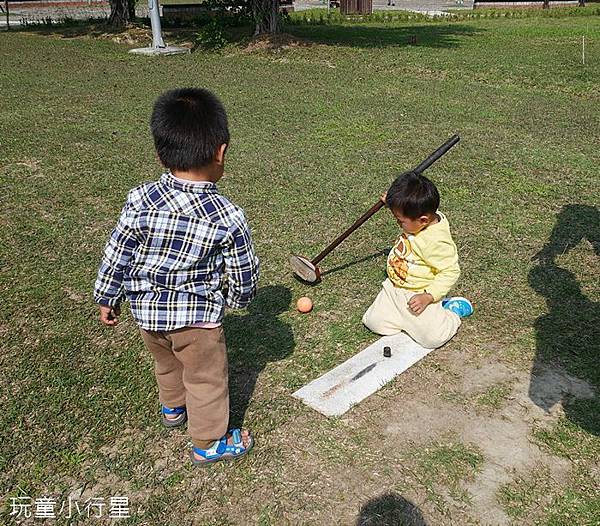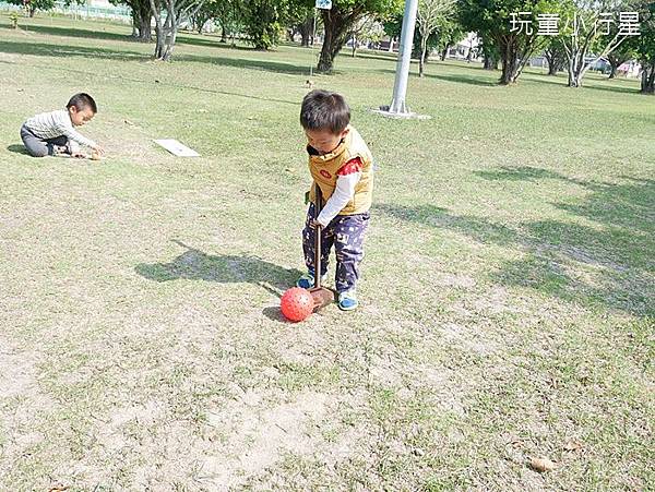 這天遇到一位阿公在玩木球隔壁的設施,這設施跟高爾夫球很類似,在拜求估狗大神之後我覺得挺類似槌球的。但槌球的球門是「ㄇ」字形,這裡設置的球門是圓形架子,中間放置鈴鐺,球通過敲擊鈴鐺而得分。這裡設置了多道球門,同樣也是一款益智動腦的休閒運動。