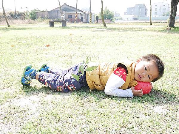 這天在公園內遇到的小朋友跟雞腿寶搶球,倆個人搶得難分攤捨。
