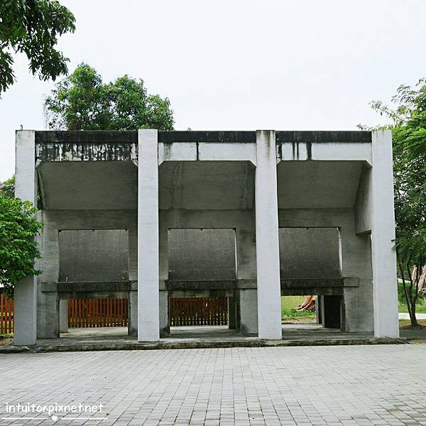 靠近杉池這面的機具工廠 ,大跨距架構架構與大面積開窗形成幾何之美,雞腿寶在其旁步道開心奔跑