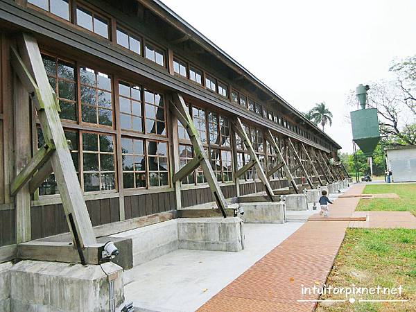 辦公室、機具工場中間廊道,水溝之間有設置連結板,無障礙空間規劃良好,推嬰兒車的遊客也能輕鬆在此散步。