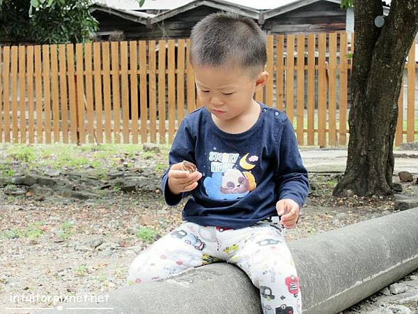 雞腿寶坐在排煙道遺址旁倒塌在地的電線桿上,撿拾到一顆蝸牛殼,神情認真的研究此物。