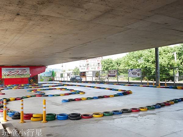 相鄰的練習場地面以彩繪的廢棄輪胎排列路線,很吸引目光。Ryan也很喜歡在這裡騎車。