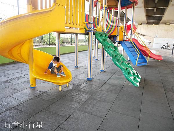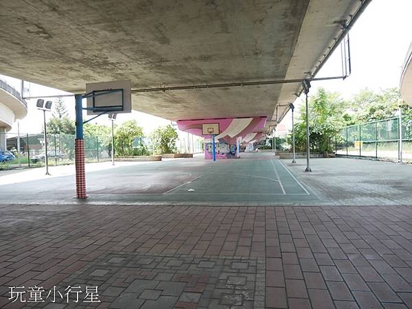 孩子如果騎累了,想玩溜滑梯,過個馬路就會看到兩座組合遊具。這裡有大人可以操作的運動設備,籃球場及羽球場。算是全家大小都能夠一起來運動的地方。
