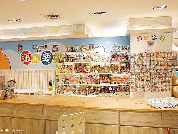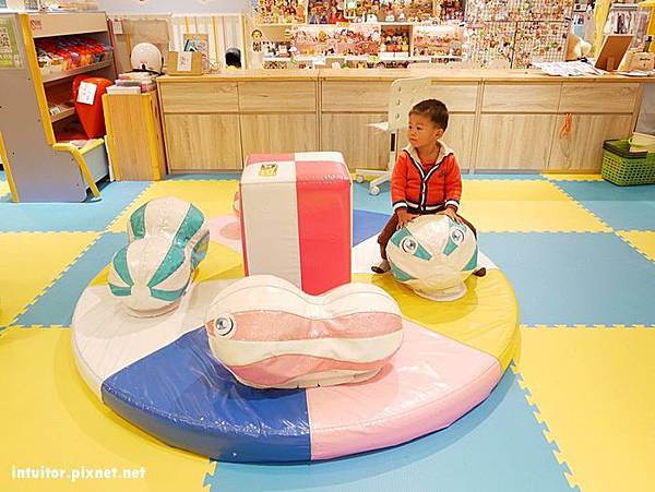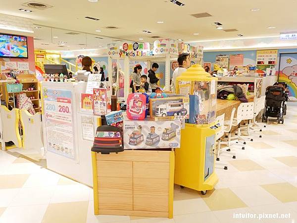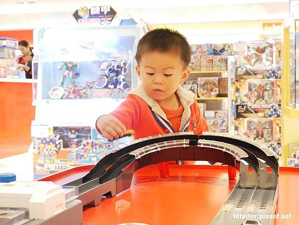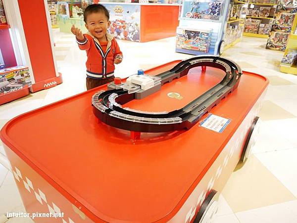 在遊戲愛樂園櫃台對面的櫃為TOMIC,櫃旁擺了一組可以讓小朋友自備小車遊玩的軌道。遊戲中途雞腿寶跑到這裡遊玩,我們拿出自備的小汽車,路過的其它兒童也紛紛湊上來,大夥來一場賽車競速。對小男生來說,車類玩具真的太吸引人了!還好雞腿寶沒有哭鬧說要我買櫃上的車子,雖然我覺得他是因為太沉浸於這組軌道而完全沒注意到一旁擺了一堆小汽車。