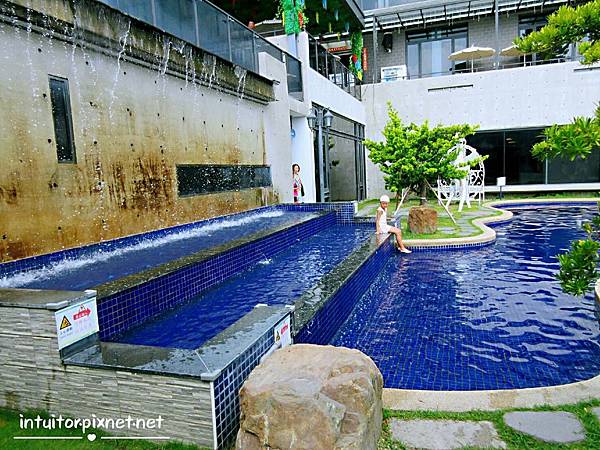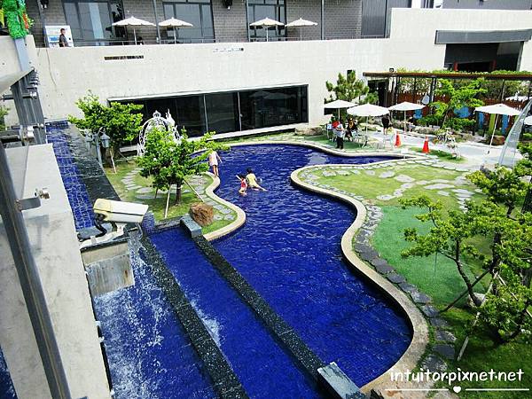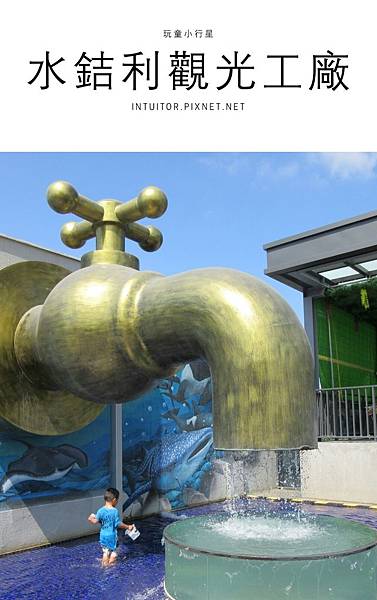 水銡利觀光工廠的戶外戲水池底部舖設深藍色磁磚,乾淨的水在陽光和藍色磁磚的映照之下視覺效果相當清涼。巨大水龍頭在二樓,大大水龍頭流出水來,水流順勢流下一樓水池階梯區形成水簾。一連串的清涼水流造景,即使沒下去遊玩也已解除了一半熱氣。