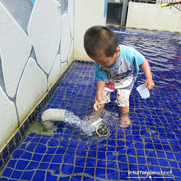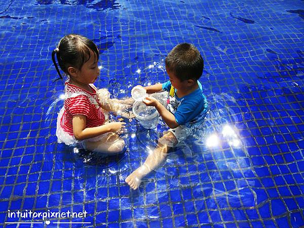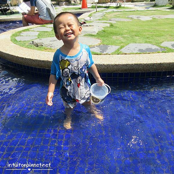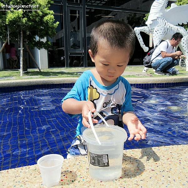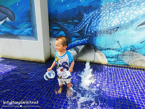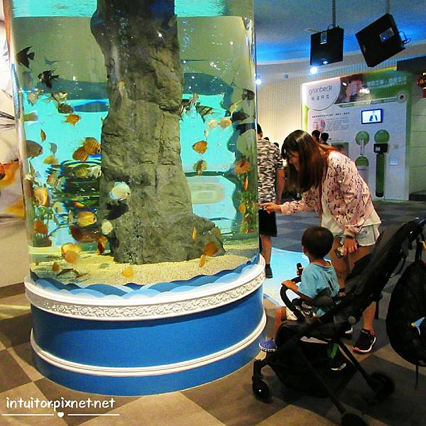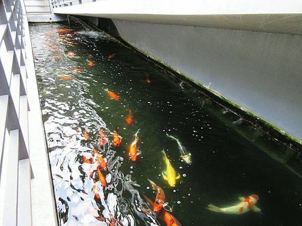 一從大門去左轉就能看到魚池,一直到去上廁所接到餐廳的通道也有一處魚池。在這裡看魚兒悠遊感覺很放鬆。不過兒童的心思早就被大大的水龍頭和清涼的水池所吸引了,這天我們在室內只能簡單逛過,到這裡玩水戲沙停留再久都不夠。