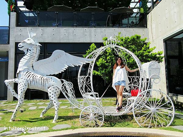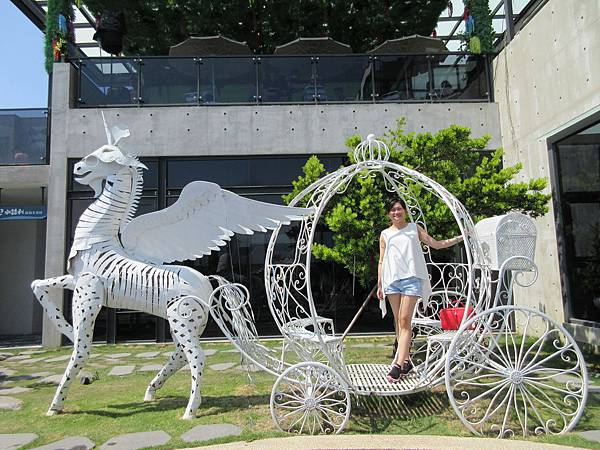 戶外水池旁設置了白色馬車造景,充滿了夢幻氛圍。可以帶禮服來此變裝拍照了(誤)剛好這天阿湧穿了白色上衣跟白色馬車配色還挺搭的。