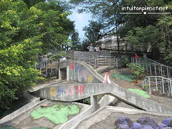 開車前往百果山風景區遊玩,汽車可路邊停車或者停放在百果山探索樂園對面的停車場再步行約8分鐘即可到達百果山風景區。有三個滑道長達75公尺的葡萄地景滑梯已經有超過二十年的歷史了,中間滑道部分段較為陡陗,年幼孩童可大人陪同遊玩。建議穿著長褲較不易磨腿。園區內有一般常見的組合遊具、蹺蹺板、堆疊成塔的水泥管、旋轉設施、擺動長板/繩、大象滑梯、單槓滑軌、白沙坑。多樣的古早味遊具設施,部分遊具上方還有林蔭遮蔽,白天遊玩不怕晒。