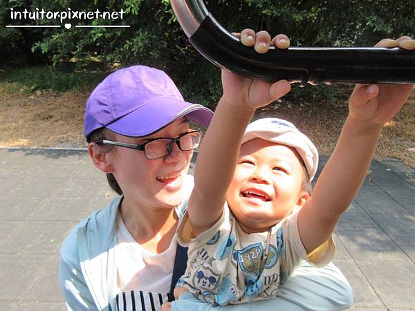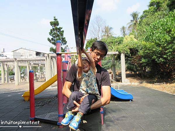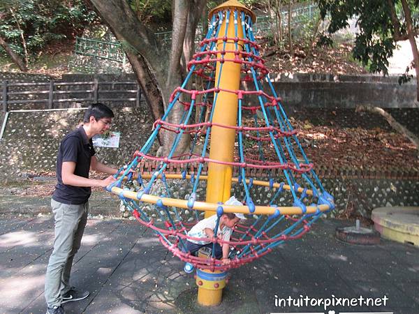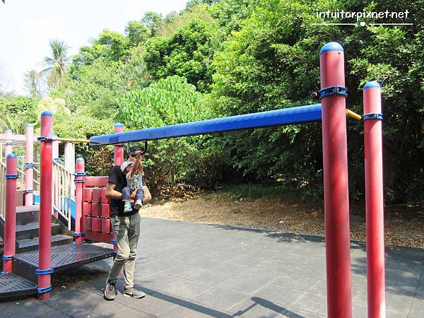 原本以為這只是一組尋常的組合遊具,走近一看發現藍色的單槓有設置滑軌!這款設施我只有在萬芳六號公園看到。雞腿寶看到我遊玩不禁也躍躍欲試,身形較小的幼童需成人協助玩耍。可以訓練手擘肌肉力量,又可感受滑溜當小泰山,這比抱式、坐式的溜索更消耗體力,兒童到此遊玩晚上會很好睡。