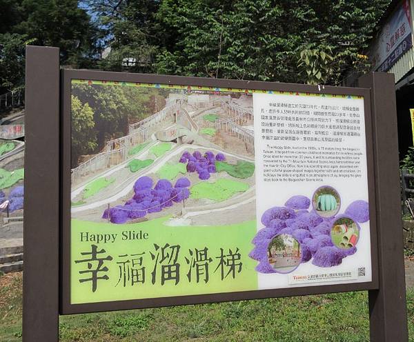 長達75公尺的葡萄地景滑梯總共有三個滑道,兩側都有階梯可拾級而上至滑梯入口。中間滑道有一小段較陡,幼小兒童建議可由家長陪同滑溜。滑道較長,加上風景區蚊蟲較多,建議可著長褲。