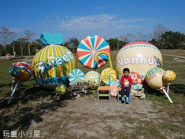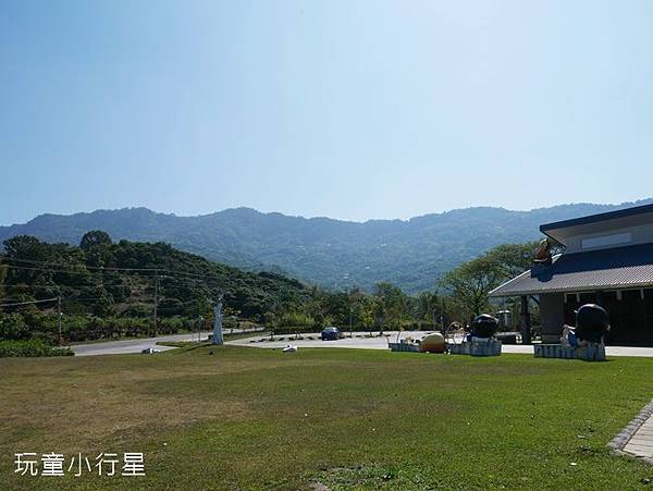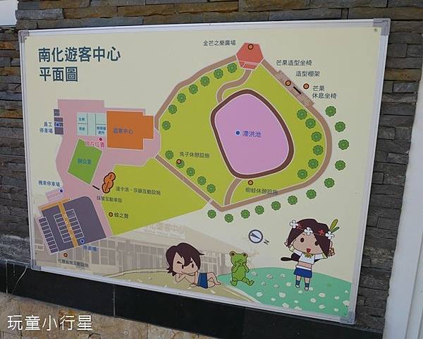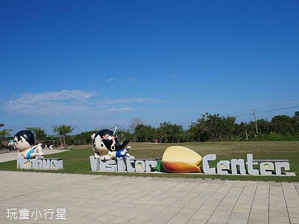 遊客中心外有寬廣的草坪可以自在散步,待周圍的樹冠拓展的更茂密,一定更適合在此野餐。可愛的動物、水果公仔,代表著南化豐饒物產(麻竹筍、芒果、龍眼乾、蜂蜜、黑糖)以及多樣的生態環境。