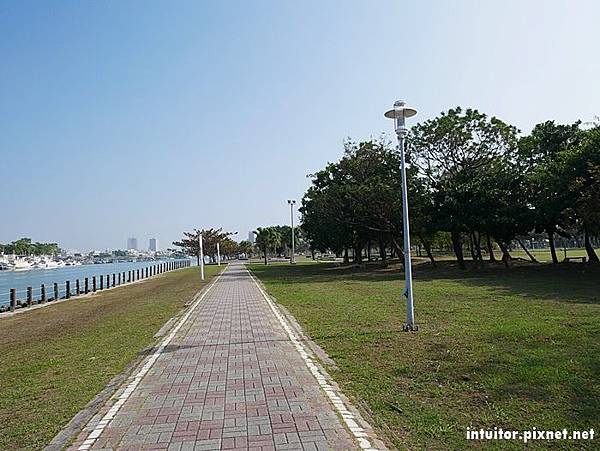 公園內步道平整,平整乾淨的草皮、相鄰的安平港可以看見船支行駛的景象。