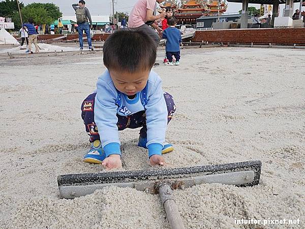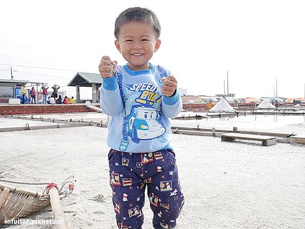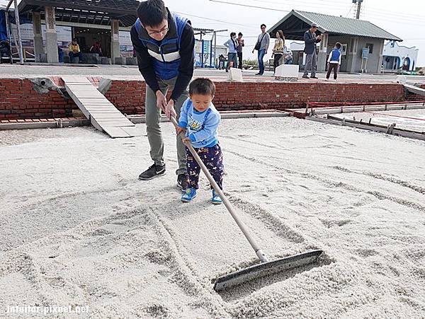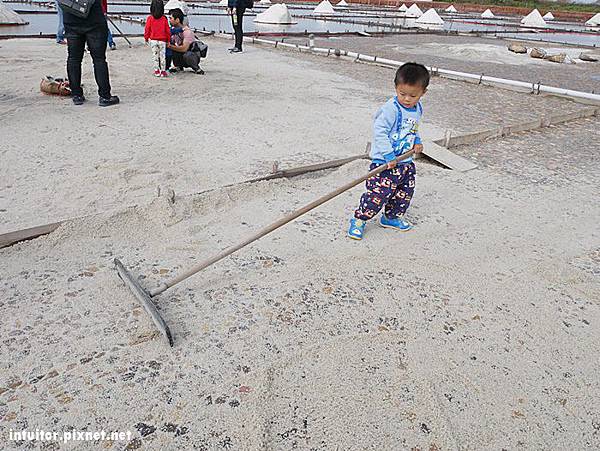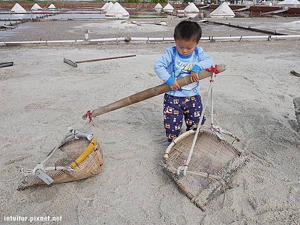 在鹽田體驗區內可以拿鹽田內的工具堆鹽巴、挑鹽巴的擔子。說真的拿這支工具在鹽田推鹽巴真的頗費力氣,在以前電動工具較不發達時,用人工擔鹽運輸,如果是在頂著大太陽的環境之下行走,光是用想的就覺得好累人。