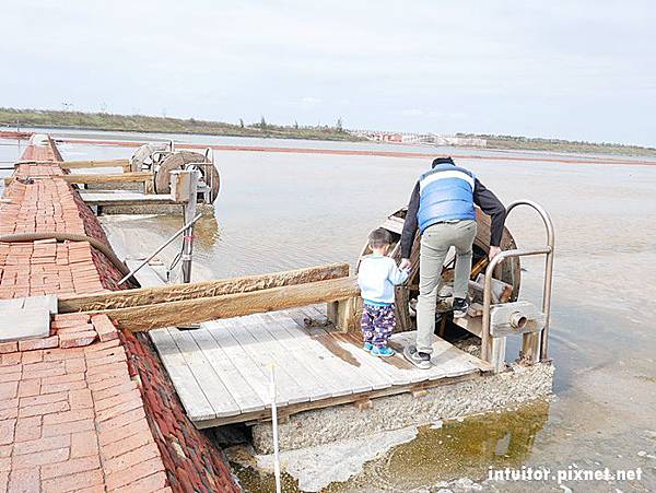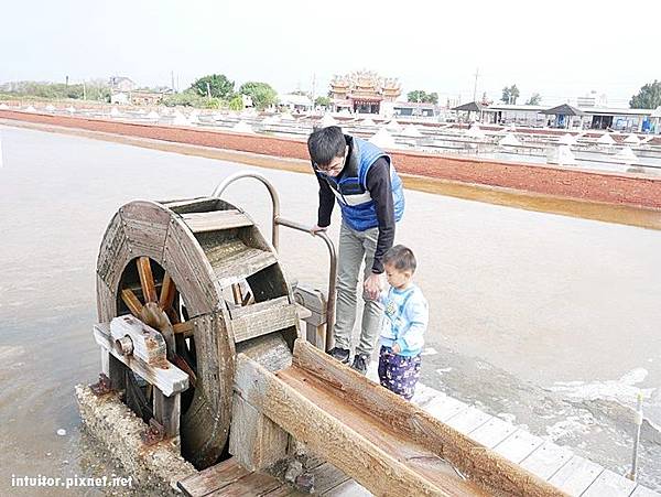 鹽田區另一側有設置水車,早期農民使用人力踩水車灌溉鹽田。實際踩上去,阻力很大,我們傾全身之力踩下一步才得以緩慢轉動,這工作真的非常非常費力。