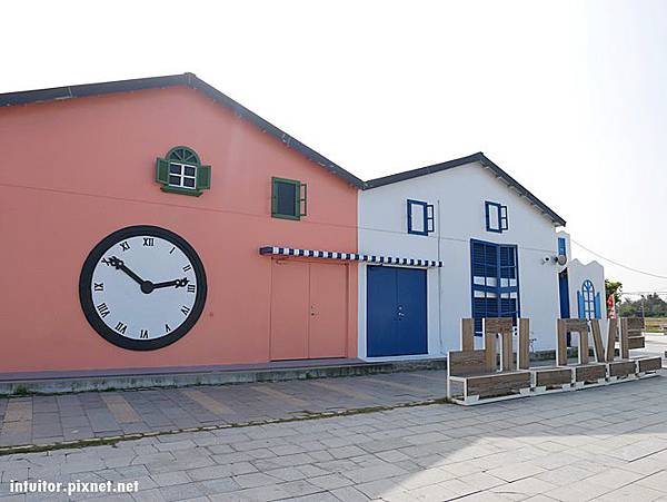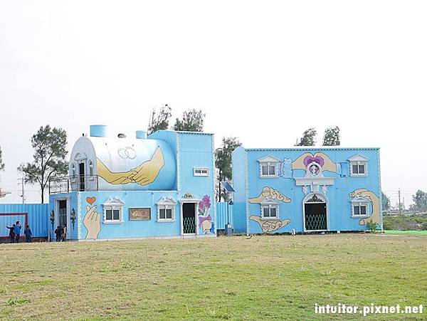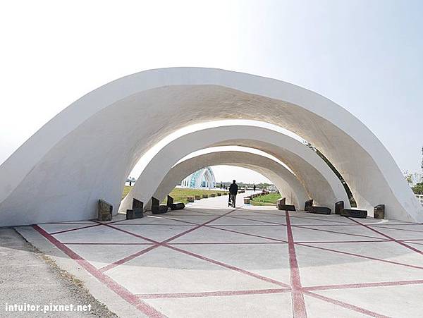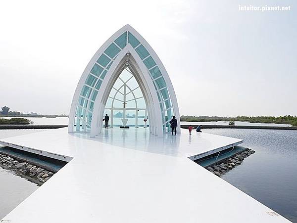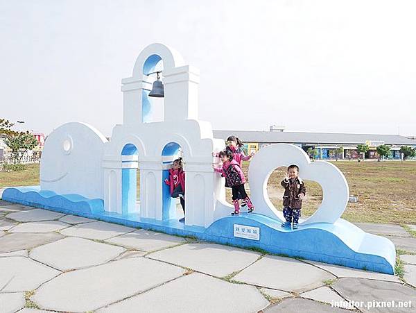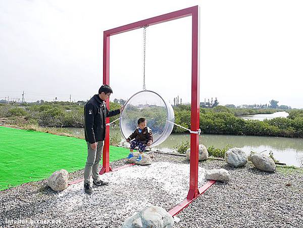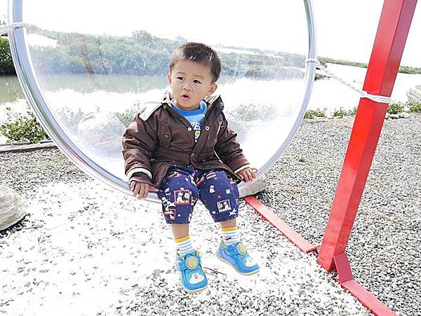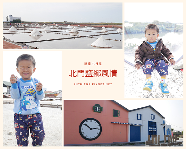 六年前和外子到北門遊玩時,就深深的被濱海鹽鄉風景所吸引,當時我們騎乘租來的腳踏車行經北門遊客中心、錢來也、烏腳病醫療紀念館、瓦盤鹽田,一路遍覽鹽鄉濱海風情。迎面吹拂略帶鹹味的海風,一望無際的空曠視野,純樸靜謐的村莊,面積空間大的北門,即使到了假日也不會覺得遊玩人潮讓人感到擁擠。六年後帶著雞腿寶重返此地,這裡增設了好多裝置藝術,在北門遊客中心附近還有一處北門婚紗美地,裡面有教堂、馬車、鞦韆…等拍照設施。