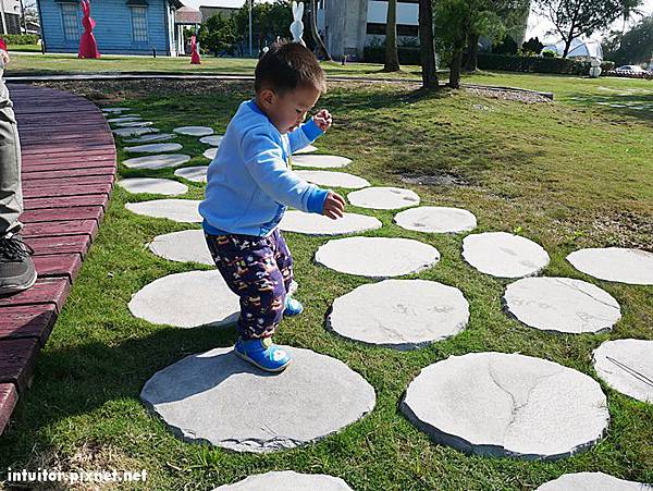 踩在一片片圓圓的石片上,讓雞腿寶覺得像是在玩跳樁一樣。
