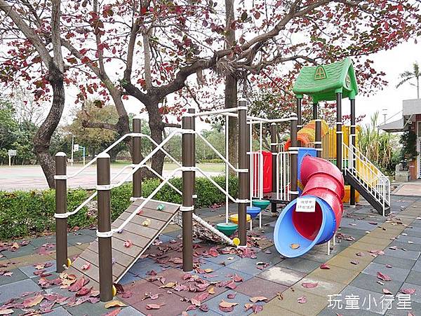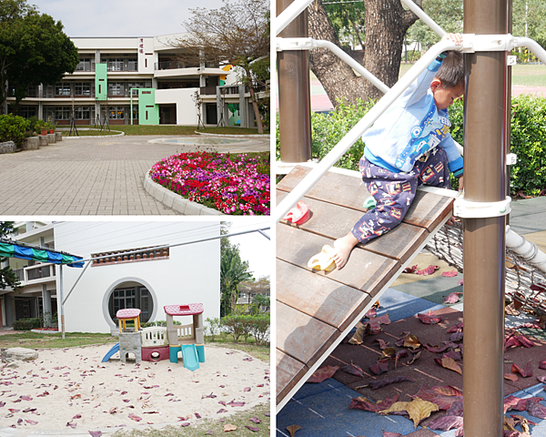 善糖國小附設幼兒園前有設置一處沙坑,沙坑內有一小型組合遊具。帶孩來此處遊玩別忘了帶上玩沙工具。我們這天再訪,沙坑上散落了好多欖仁樹的葉子。孩子們可以撿拾樹葉,將樹葉當盤子盛沙。