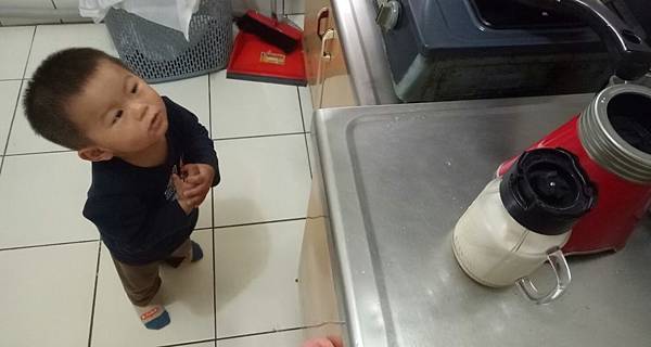 雞腿寶站在果汁機旁邊非常期待