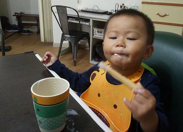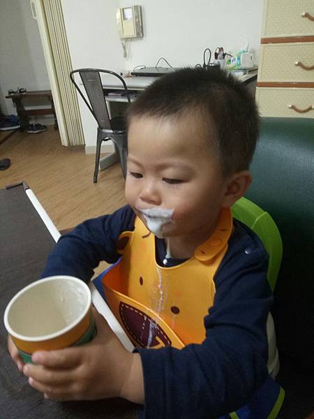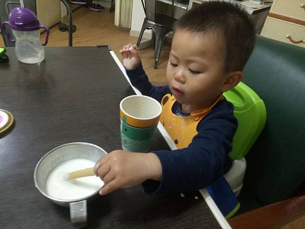 讓他用純新牛奶棒當攪拌棒沾潤香蕉牛奶,