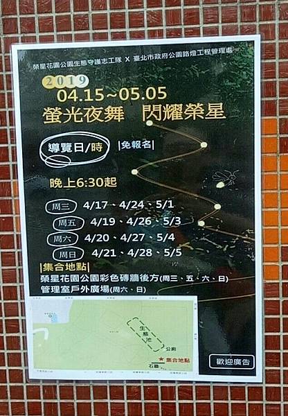 ▼榮星花園螢火蟲,2019年4-5月螢火蟲導覽時段