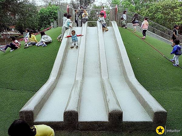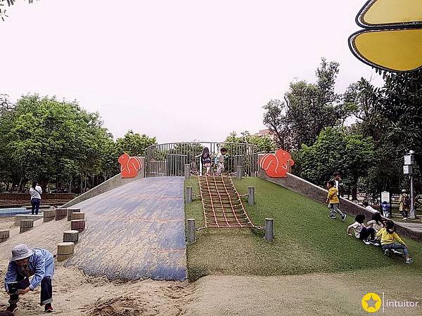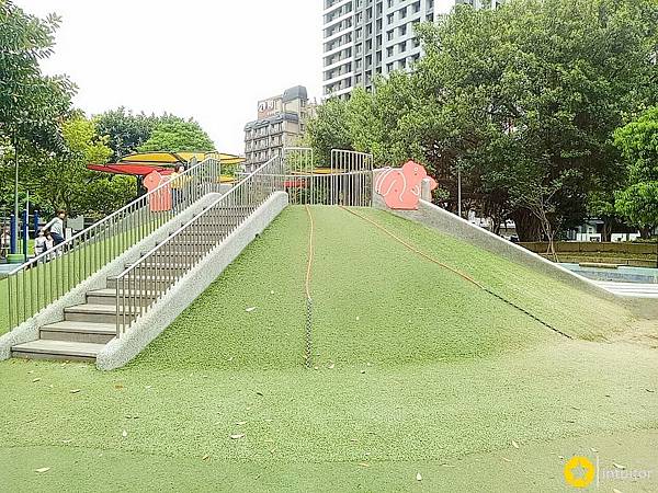 登頂方式可由樓梯、攀爬網OR繩向上,大部分孩童喜歡踩在草坡上行走上去。