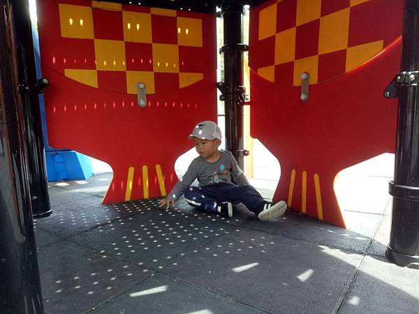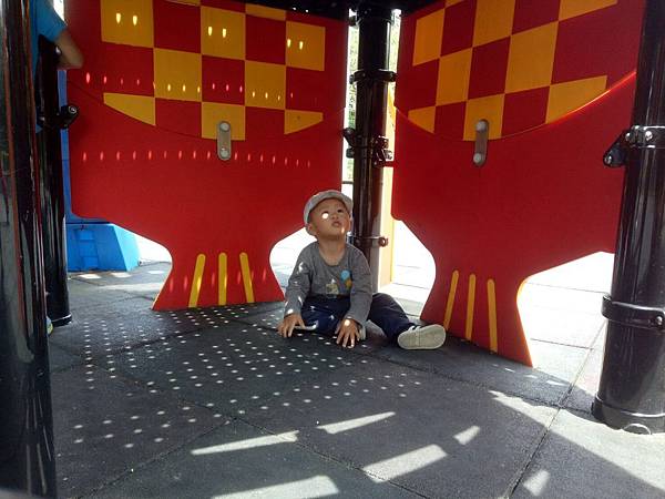 目測堡壘內部乾淨。還記得我第一次去嘉義公園的飛碟滑梯,看到滑梯內部空間置放了疑似遊民的個人物品, 因此那回我沒讓雞腿寶下去玩耍