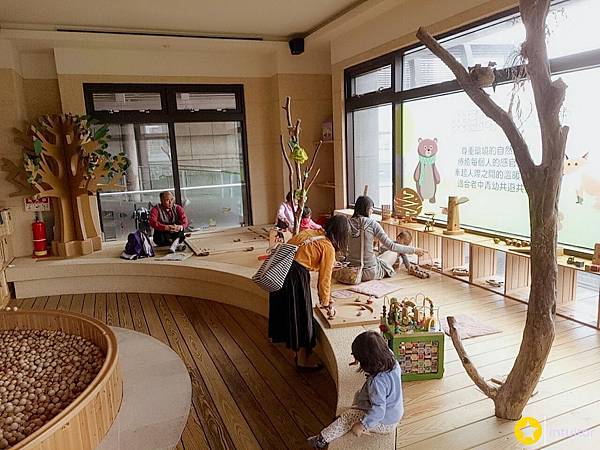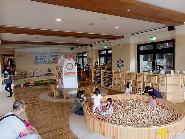 超大的木頭球池,雞腿寶一入館就衝到這區玩