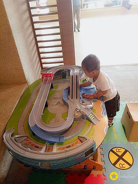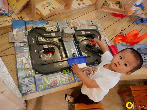 靠近廁所旁的停車場玩具區,這裡有多組停車場、軌道、小汽車,小朋友在此遊玩常常擠得水洩不通