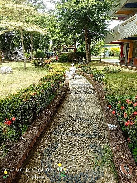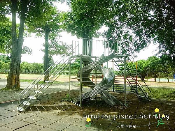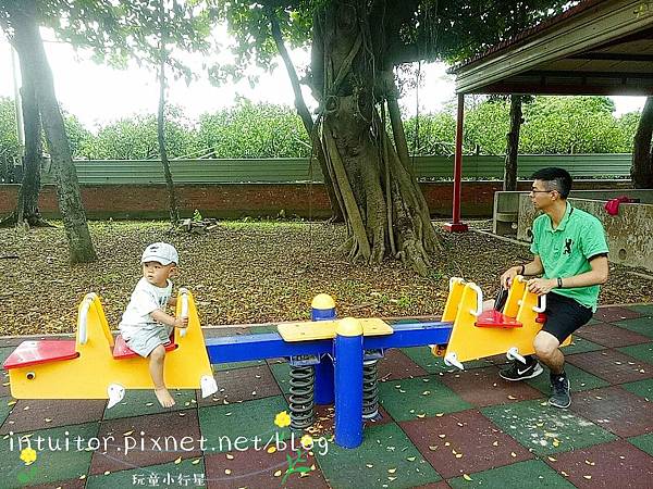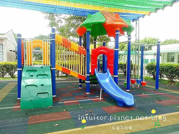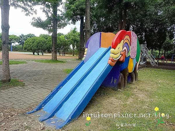 ▼文正國小遊戲區彩色大象滑梯,滑梯旁有黑板樹遮蔭,