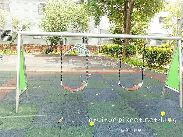 ▼文正國小遊戲區共有三組7個鞦韆、搖搖馬、蹺蹺板、金屬材質螺旋滑梯