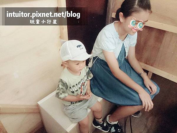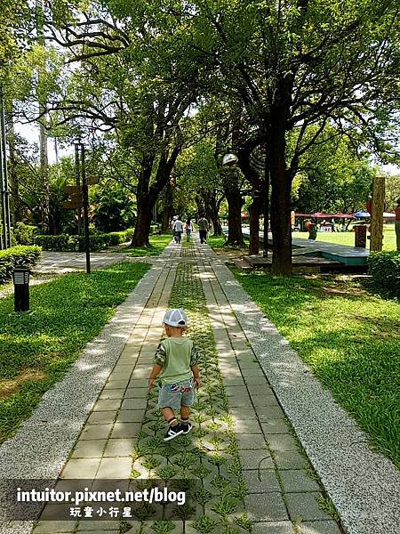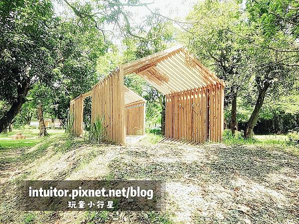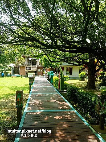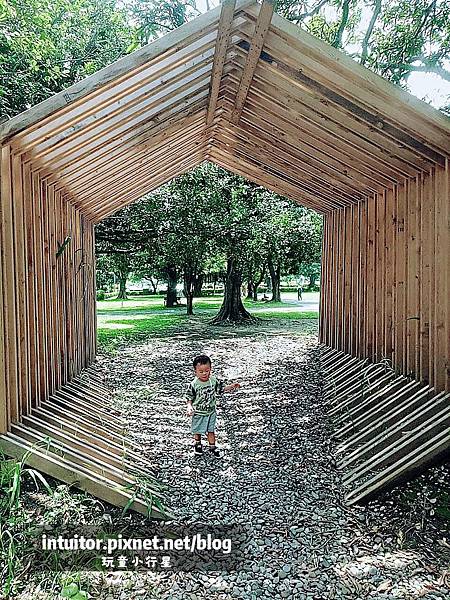 ▼總爺藝文中心草坪上的木棧隧道很吸引雞腿寶注意