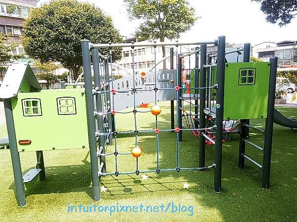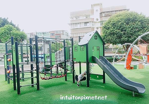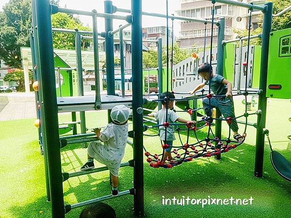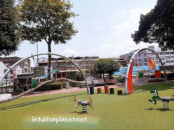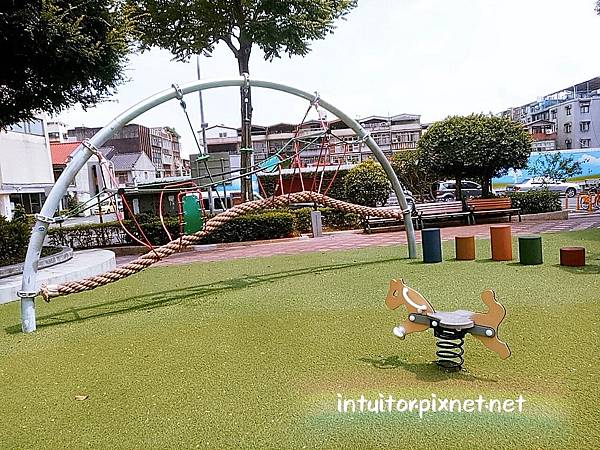 公園內遊戲場遊具採分齡設計,組合遊具、搖搖樂適合小童。