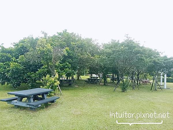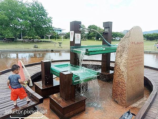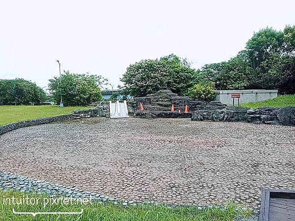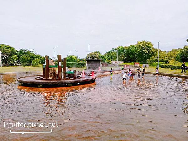 兒童可鑽進水泥水管至沙坑內遊玩,鄰近樹蔭下有設置桌椅方便家長在旁觀看孩童玩耍情形。