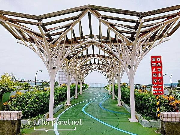 這個空橋可以銜接到彩虹河濱公園,在這個路段要下來牽引避免撞到在運動公園遊憩的遊客