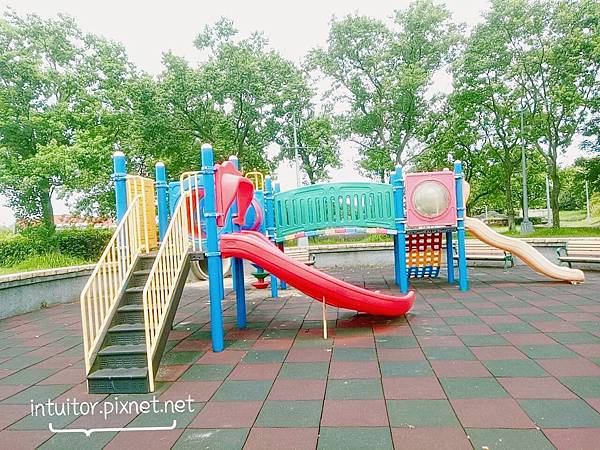 在沙坑旁有一組合遊具,上方較無遮蔭,需做好防晒,注意通風和休息。
