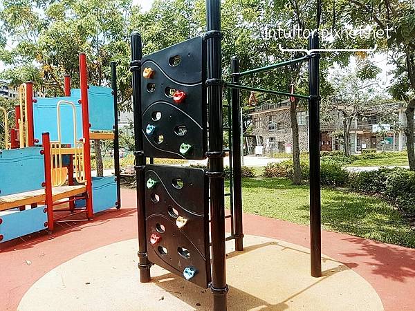 垂直角度適合大一點的孩童使用,遊具上設置橫槓、岩塊可藉此攀爬而上