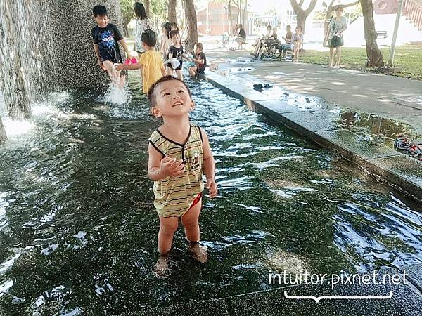 戲水區旁有濃密的樹冠,在樹葉的蒸散作用下周遭環境更加清涼。水池上的拱門會定時降水下來形成水濂,戲水池面積沒有我們前一站的民族公園大,永康公園位於社區內環境更為清靜。在此遊玩不怕晒又涼爽。