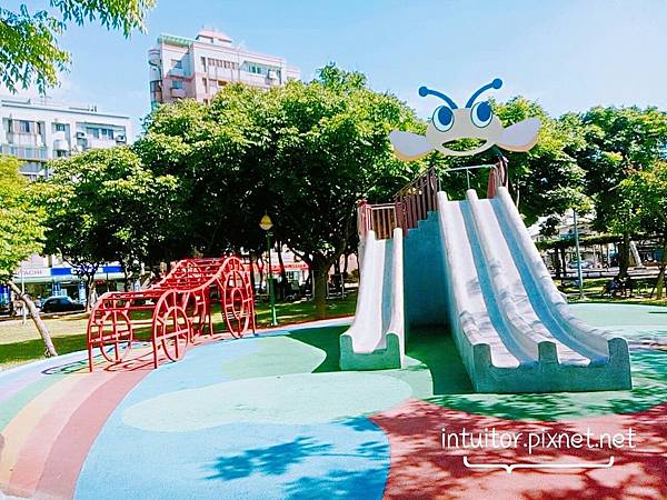 前一站我們在近期很熱門的民族公園戲水,無公廁、只有一間更衣布加上遮蔽面積少,我們熱得受不了,轉移陣地到位於社區內的永康公園。一到公園看到有溜冰場、公廁、遮蔽天幕、展演區、蜜蜂造型特色遊戲場,