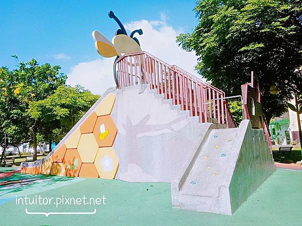 ▼蜜蜂造型磨石滑梯,結合攀爬