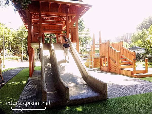 三色塑膠滑梯下方亦可遊戲,塑膠滑面在白天高溫下會較高,使用前請注意。