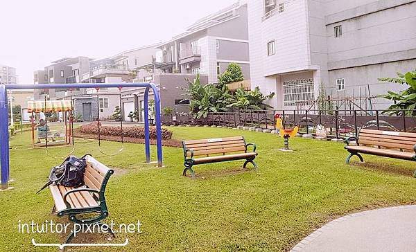 水池旁設置了三個休息座椅,一組搖搖樂、兩個鞦韆、一組搖搖椅