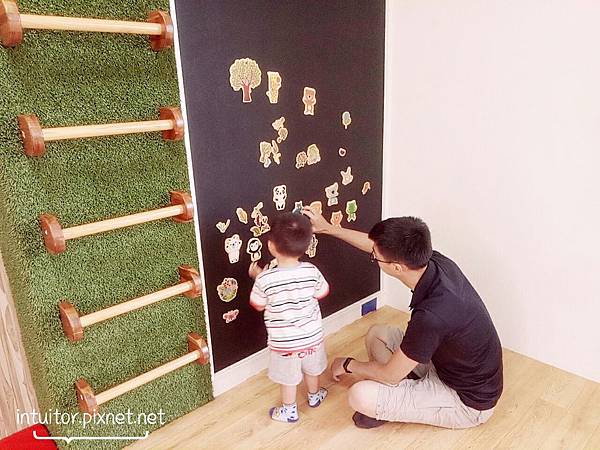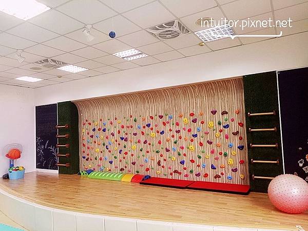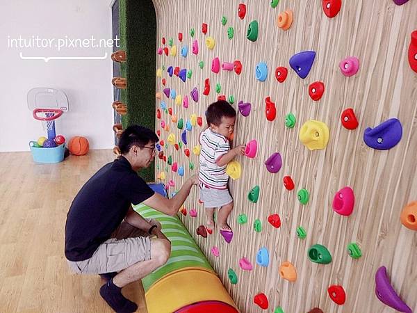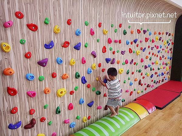 最讓我感到驚豔的是親子館內居然有垂直面的攀岩牆,牆面上的岩塊每塊造型各異。