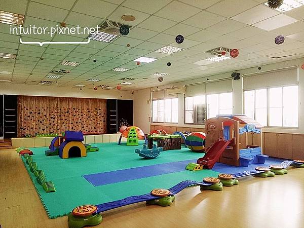 體能區內有多種大型感統遊具、攀岩牆,地面舖設大塊巧拼。適合年幼孩童在此進行大肢體運動。
