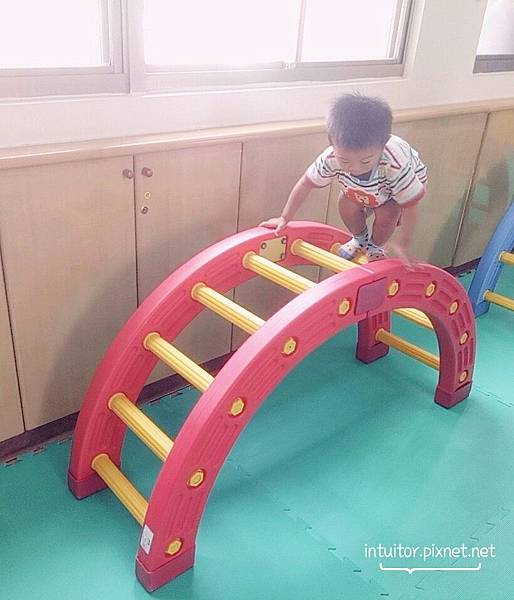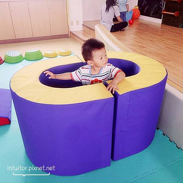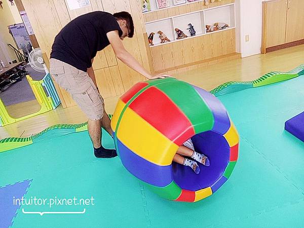 這個外形像酒桶的遊具,雞腿寶一看到就鑽進去,爸爸在旁邊輕推滾動,雞腿寶像隻小蟲般在滾筒內同時也動個不停。
