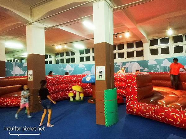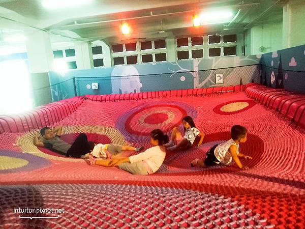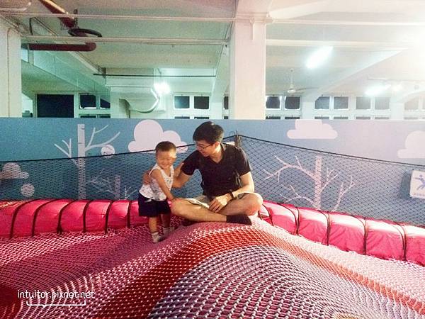 雞腿寶第一次玩氣墊床,踩在上面還有點不知所措,後來漸漸發現它的好玩之處。假日較多兒童遊玩追逐,年紀較小的孩童在此遊戲務必要照顧者在旁看顧以免被撞傷。