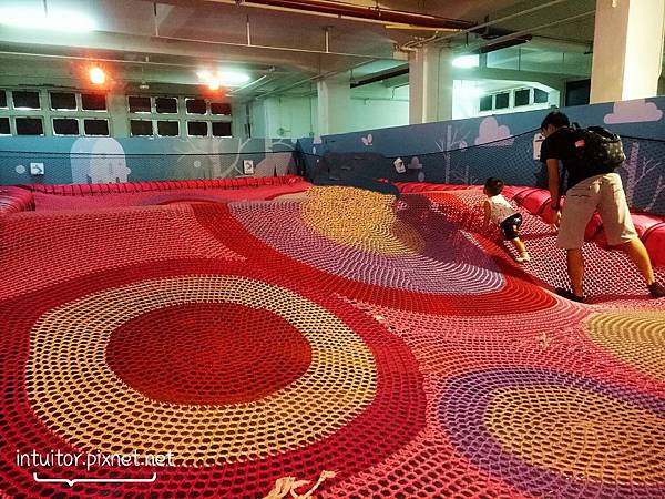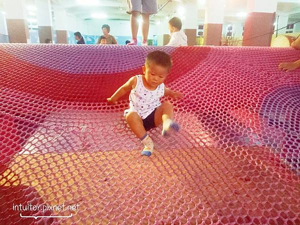 來了來了!是日最消耗雞腿寶體力的設施就是這一大片密密的攀爬網。這面攀爬網裝置有設置坡度,踩在上面可以彈跳、滑溜、攀爬、翻滾。雞腿寶是日在此消耗大量體力,我在此跟著他來來往往肚子也餓得好快啊XD