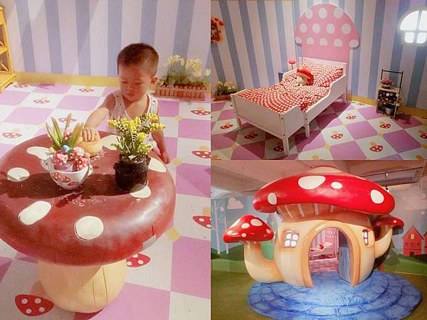 小巧的床、繽紛的蘑菇圖案填滿視線。可愛的造景,迷你的用具,加上明亮的色彩襯托,在這裡你會忍不住幫自己的孩子多拍幾張照片。